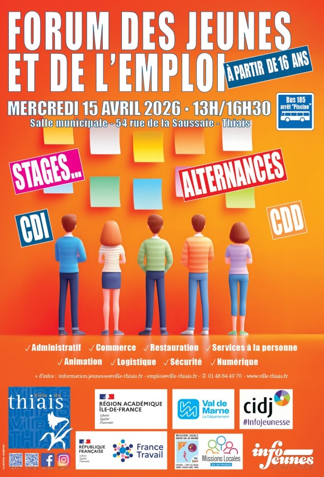 Venez nombreux au Forum des jeunes et de l'emploi le 15 avril 2026 de 13h à 16h30 organisé par la ville de Thiais.