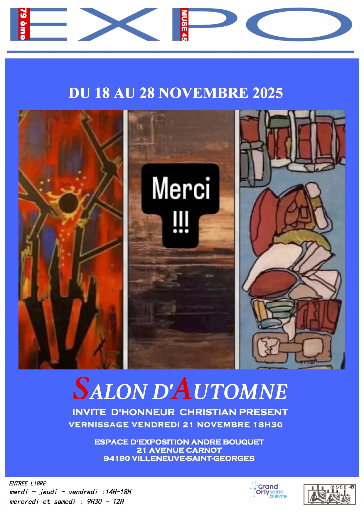 Horaires d'ouverture du mardi au vendredi de 14h à 18h et mercredi et samedi de 9h30 à 12h